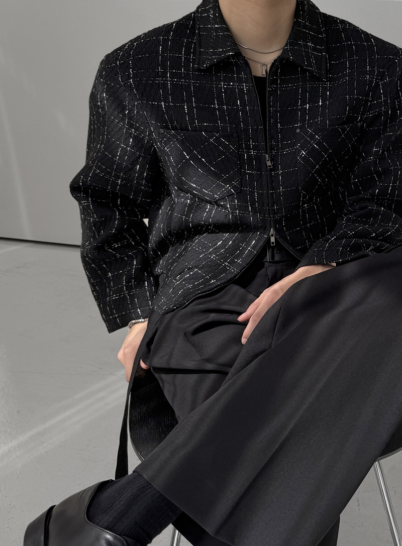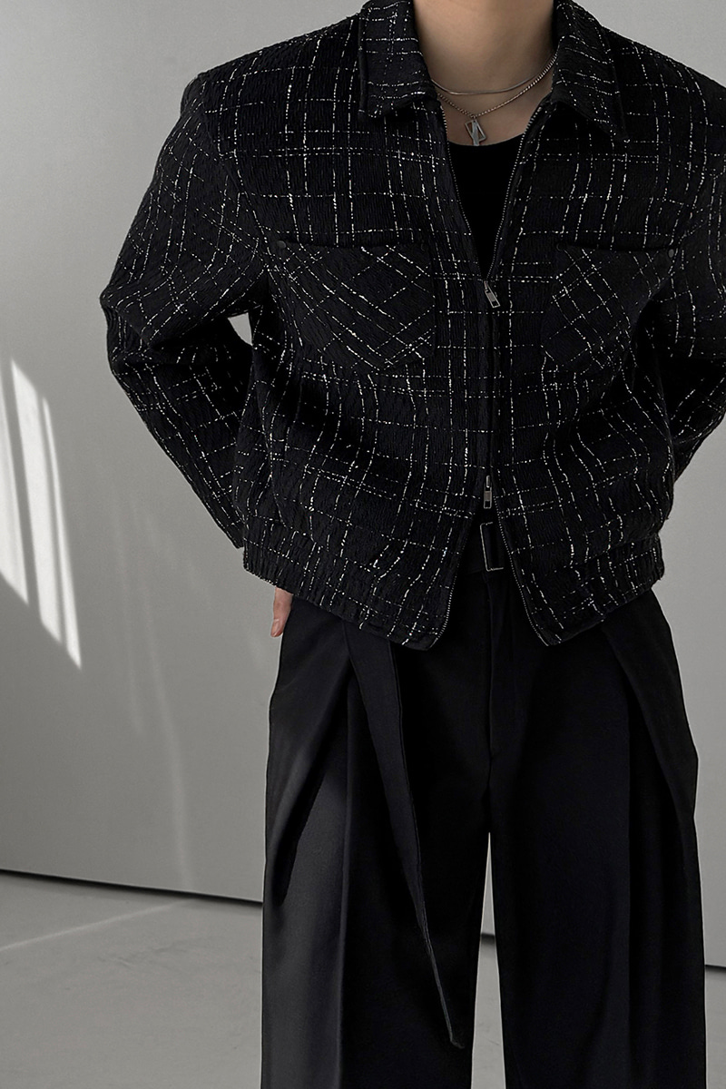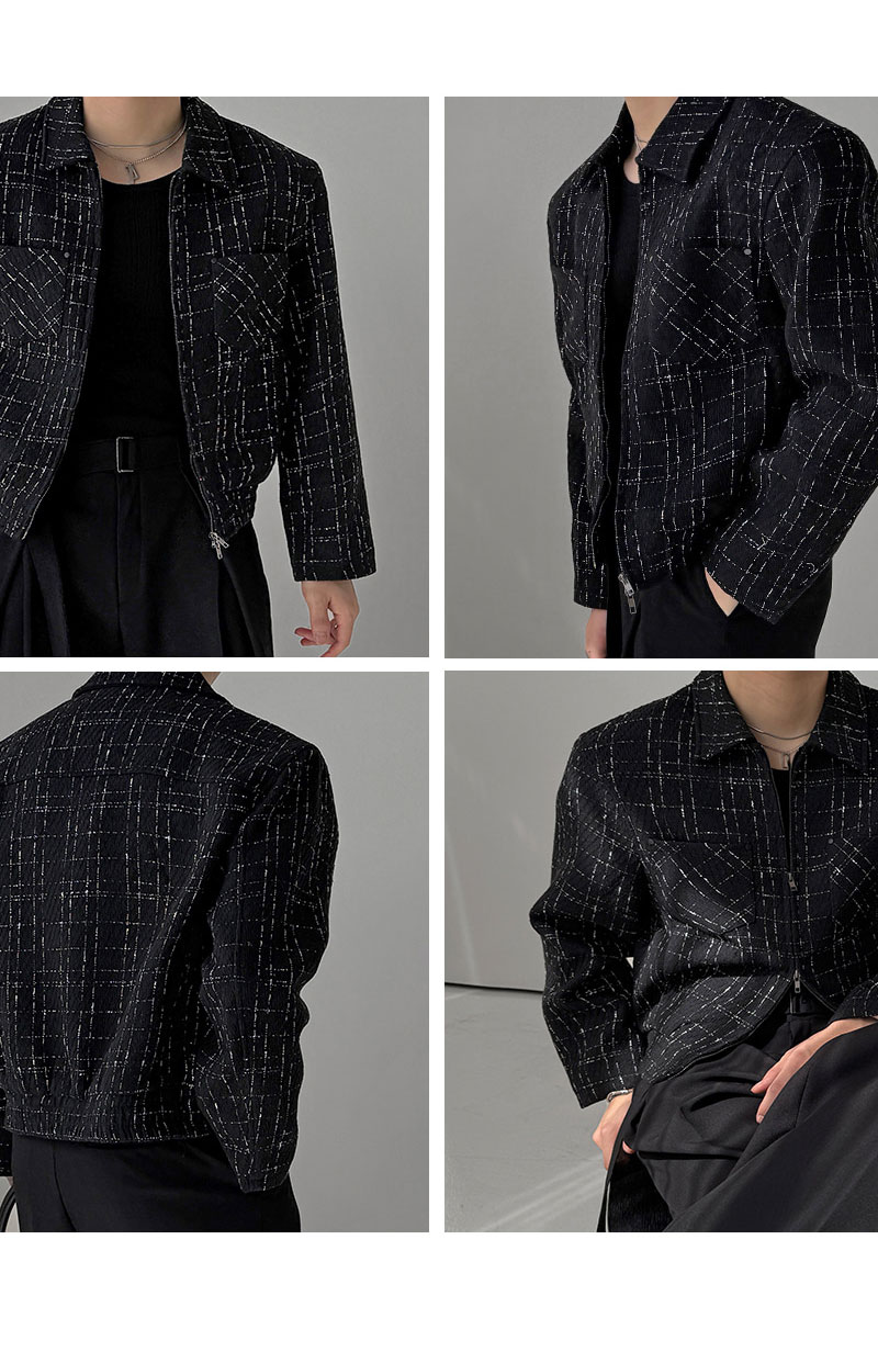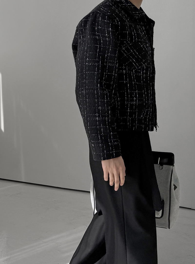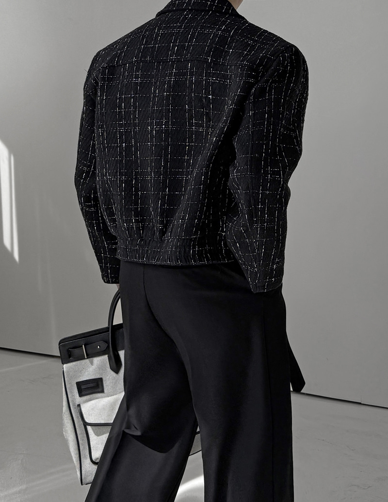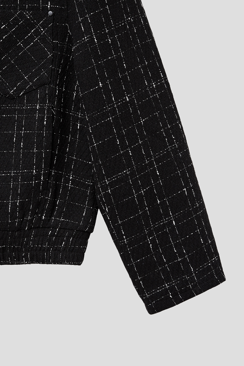 奢華格紋織線粗呢雙口袋短版夾克外套 黑色 1229