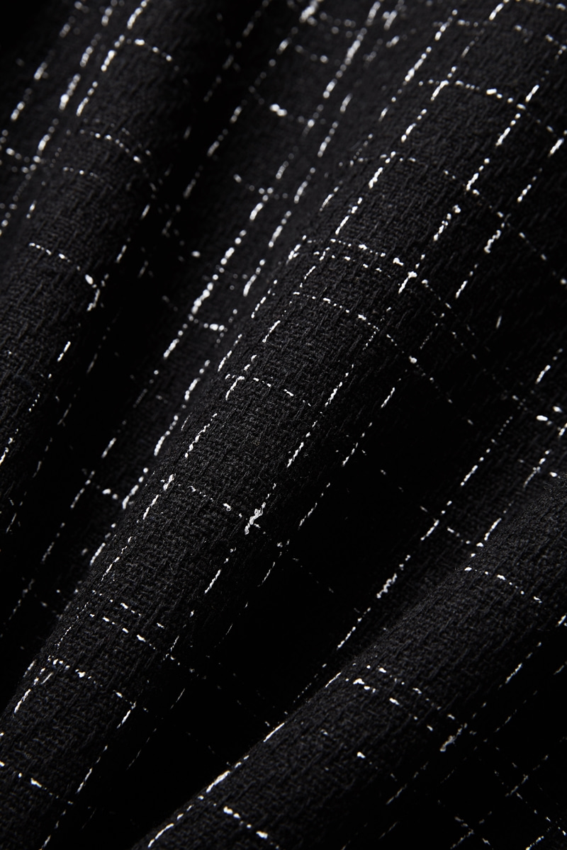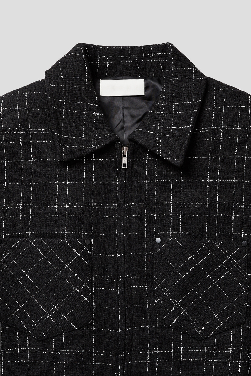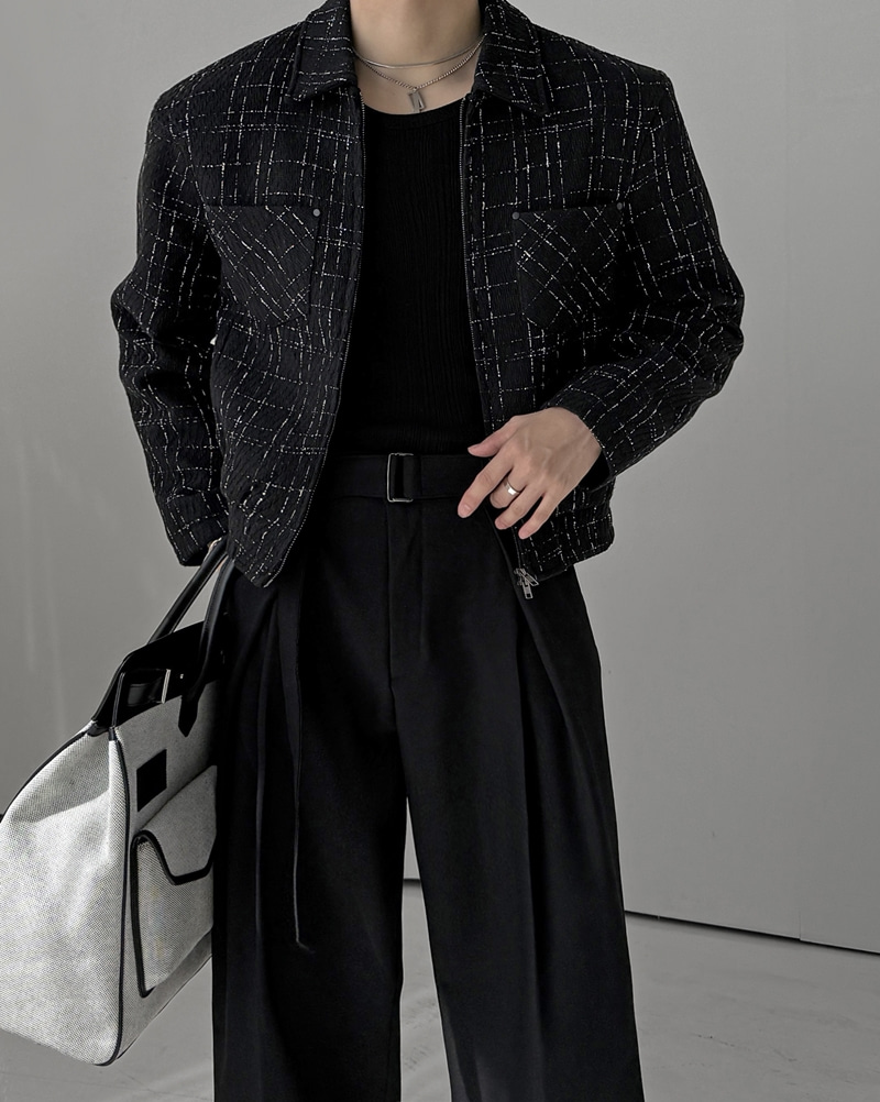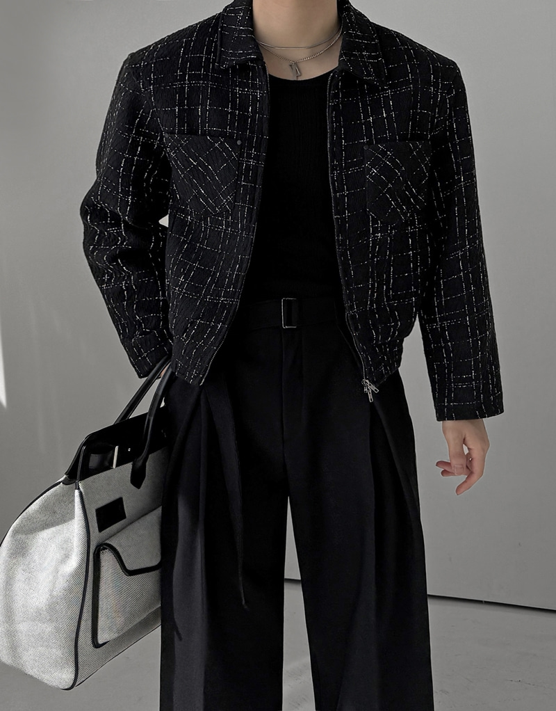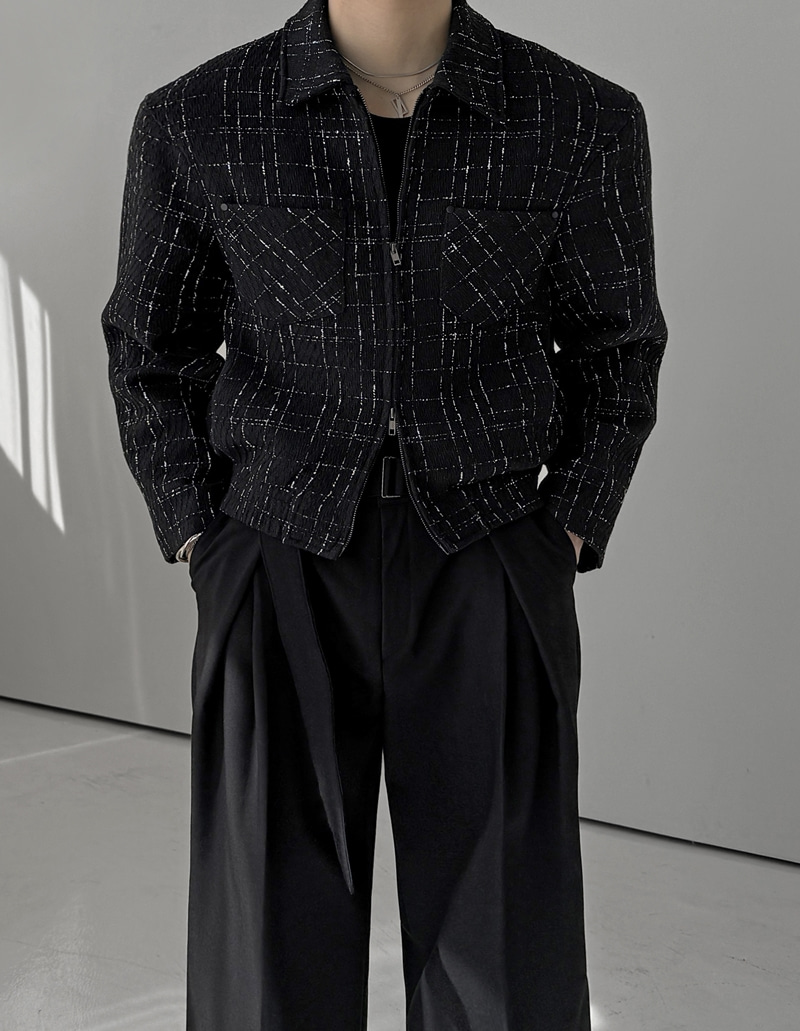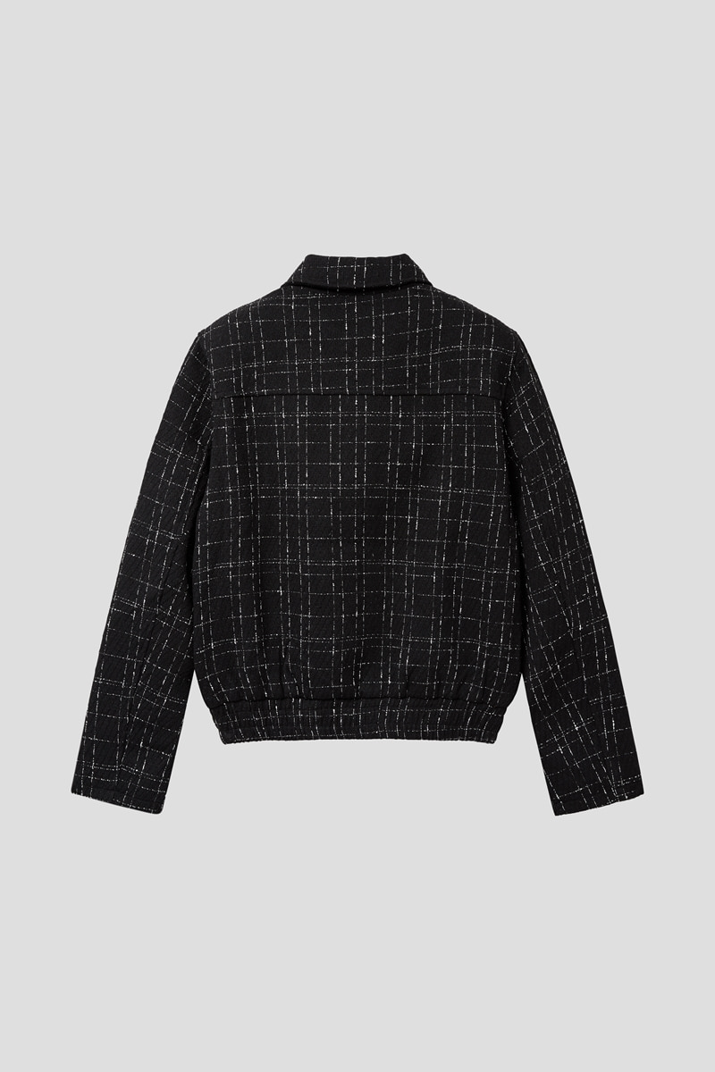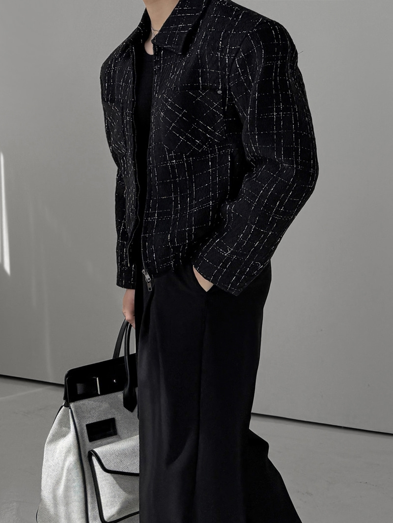 奢華格紋織線粗呢雙口袋短版夾克外套 黑色 1229