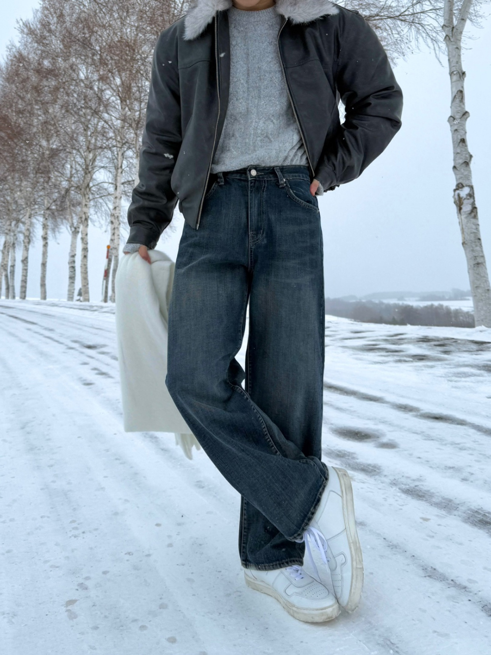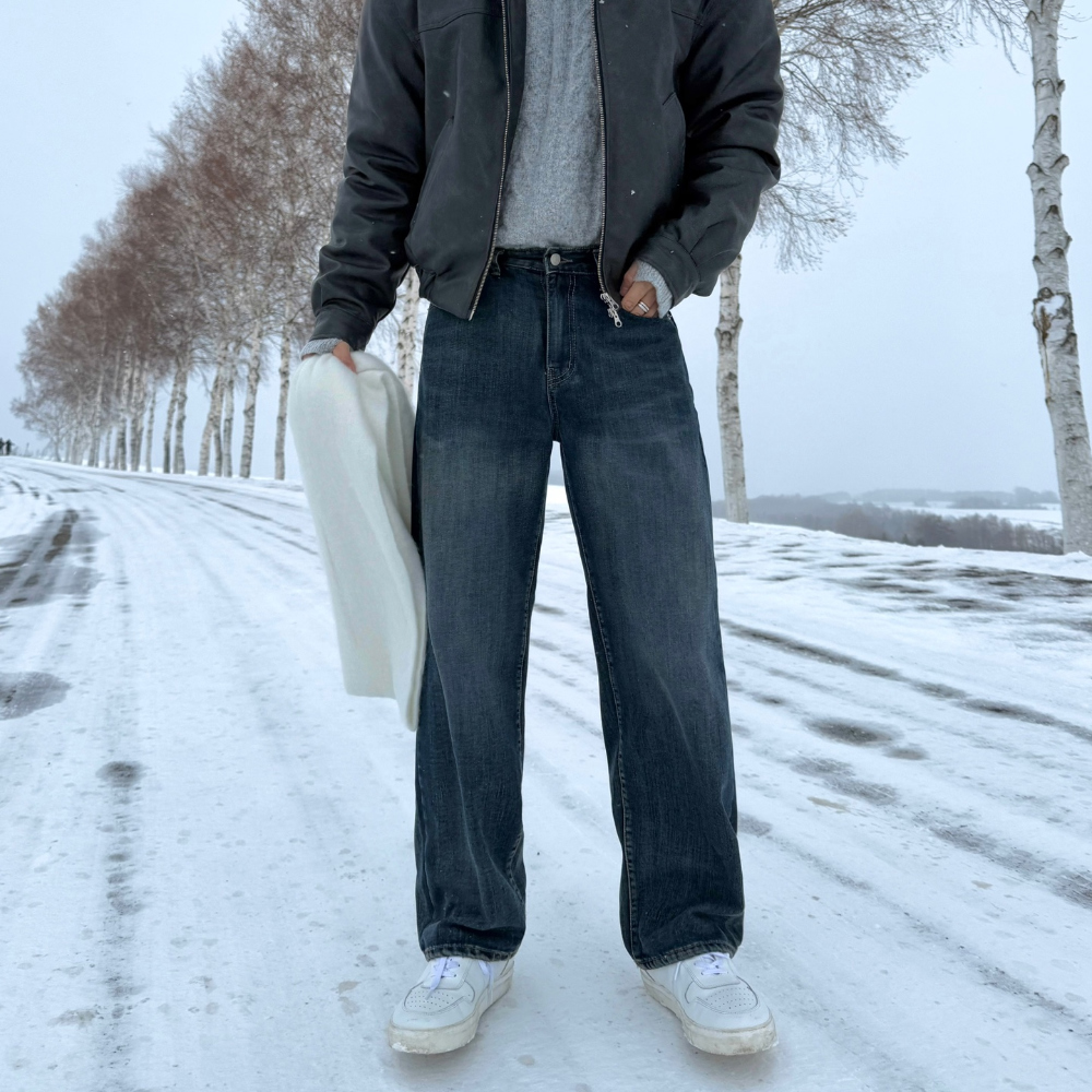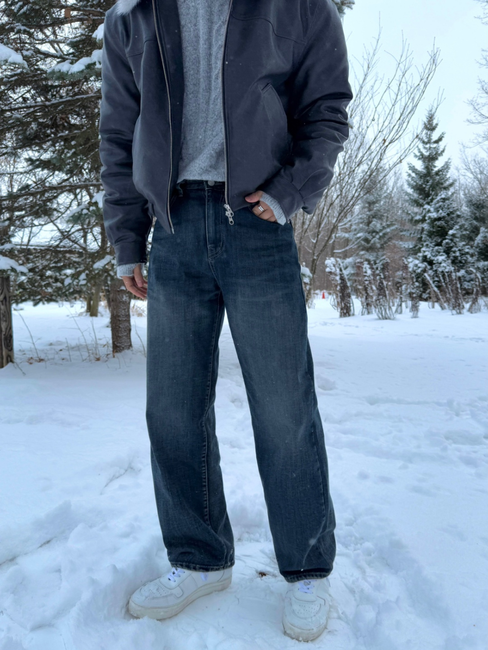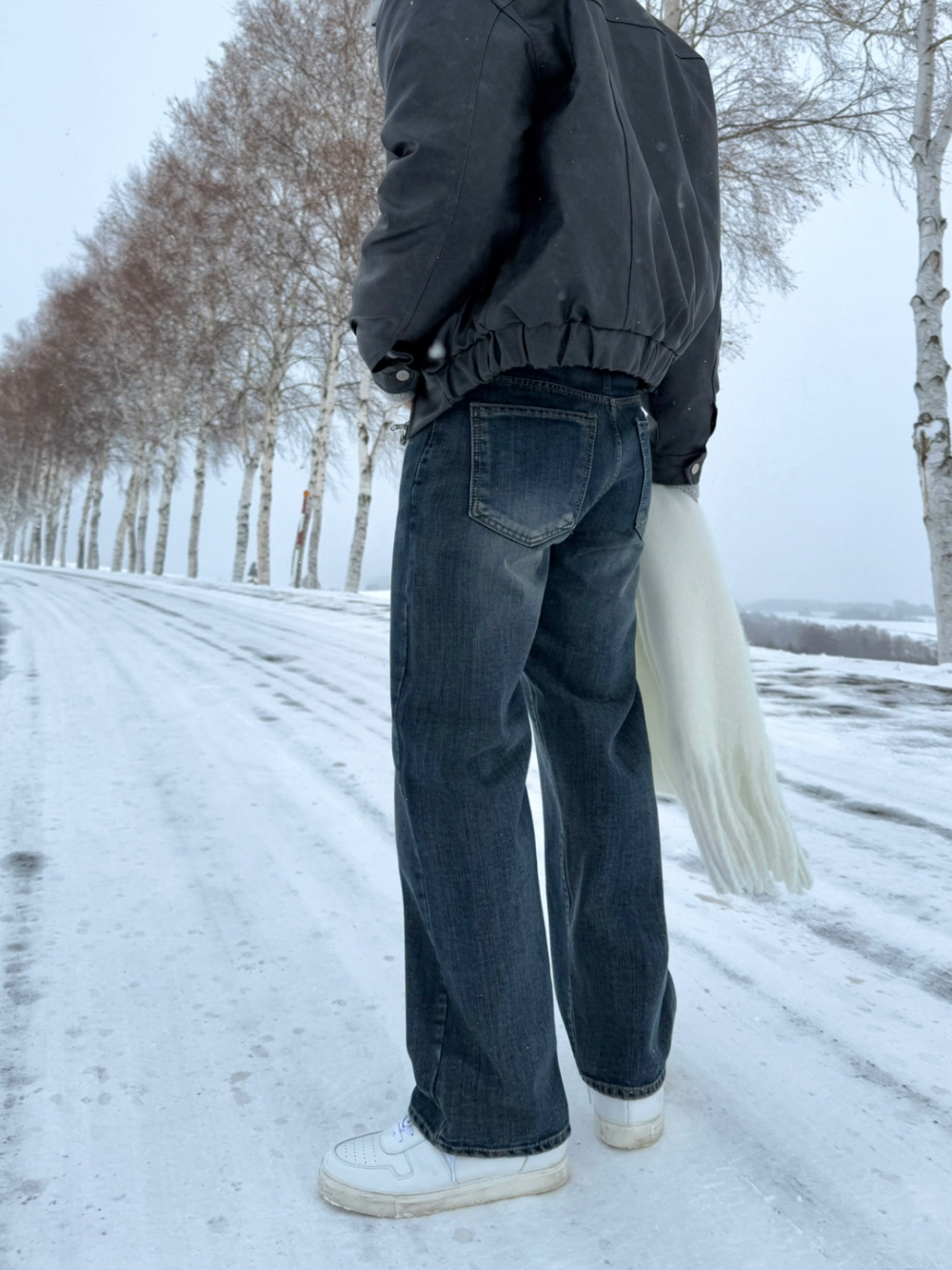 奢華經典刷色內抓絨半寬直筒牛仔長褲 深藍 1110