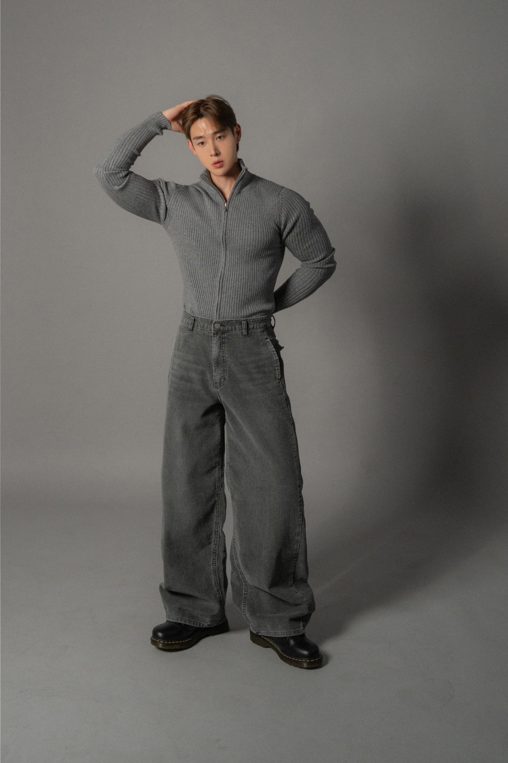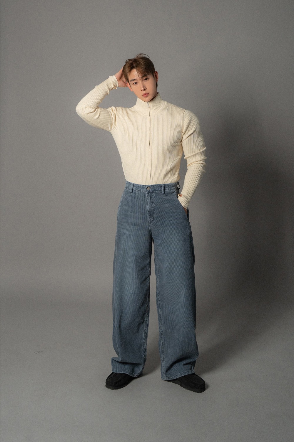 圖中上衣:[肌肉款柔軟羅紋針織高領拉鍊開襟衫]